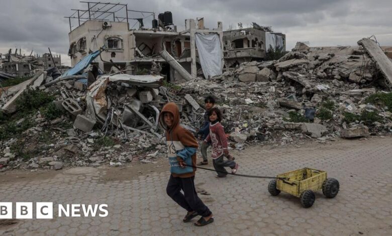 Getty Images Palestinian children walk past destroyed buildings and makeshift shelters in Beit Lahia, northern Gaza Getty Images