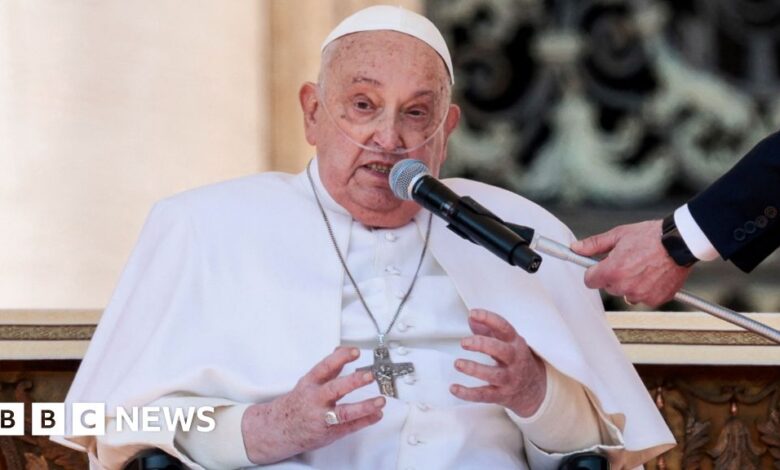 The Pope briefly appeared on stage in a wheelchair, with a breathing tube under his nose.