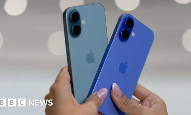 Reuters A woman's hands shown clasping two blue iPhone 16 handsets at a launch event in September.Reuters